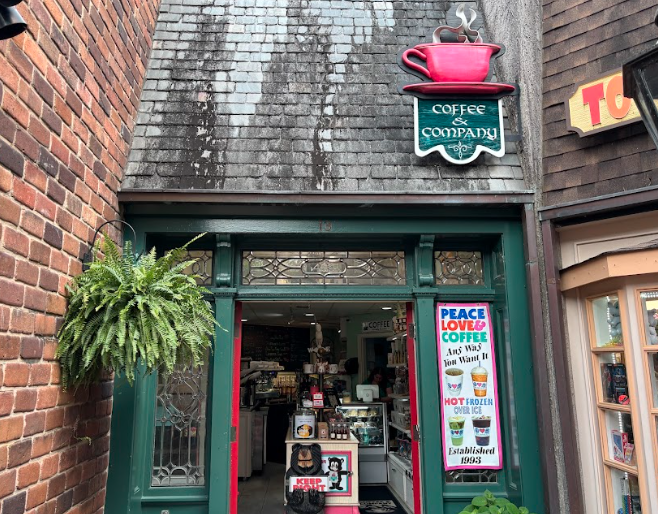 A small coffee shop serving locally roasted coffee, espresso drinks, and tea in The Village walkway.