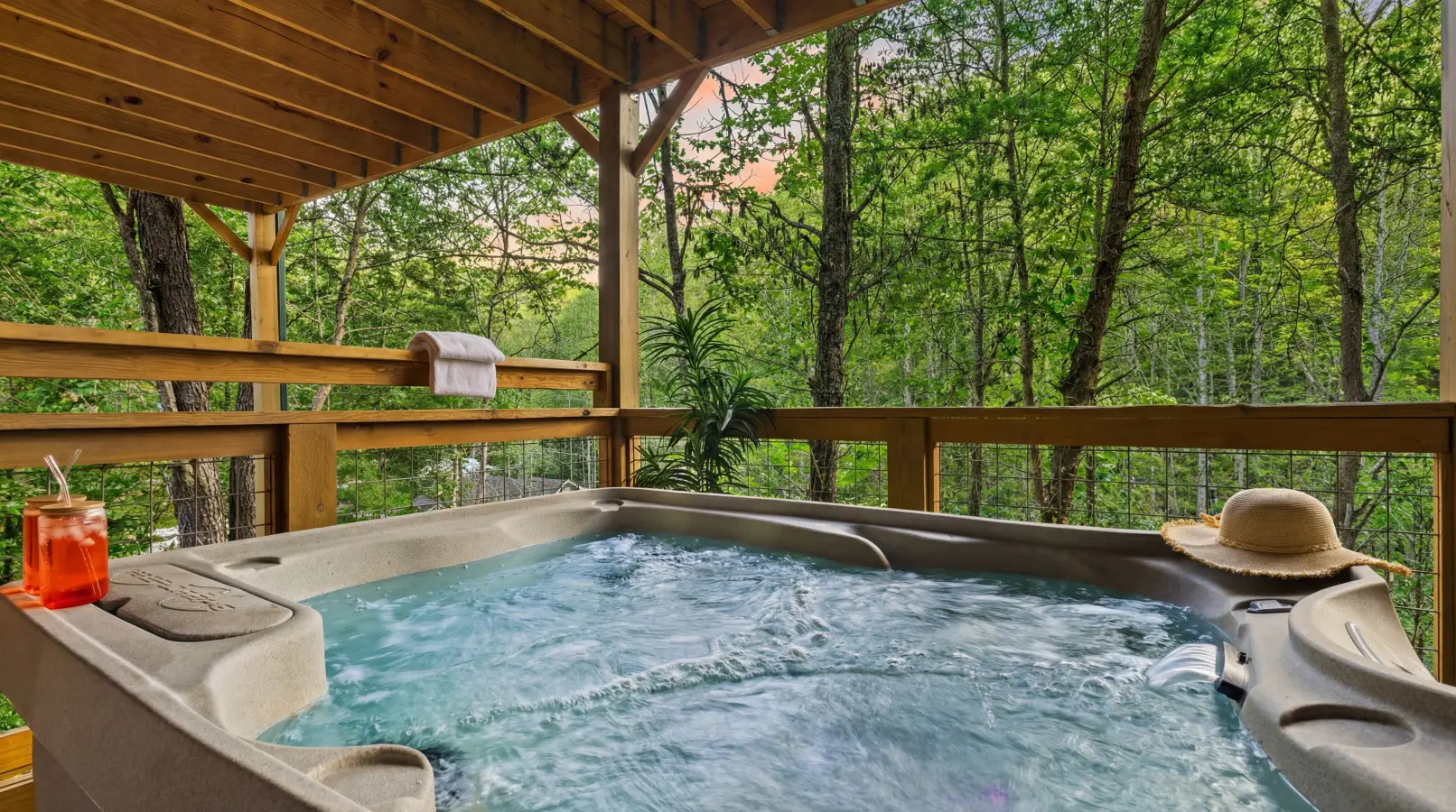 Relax in the hot tub with a partial wooded view.