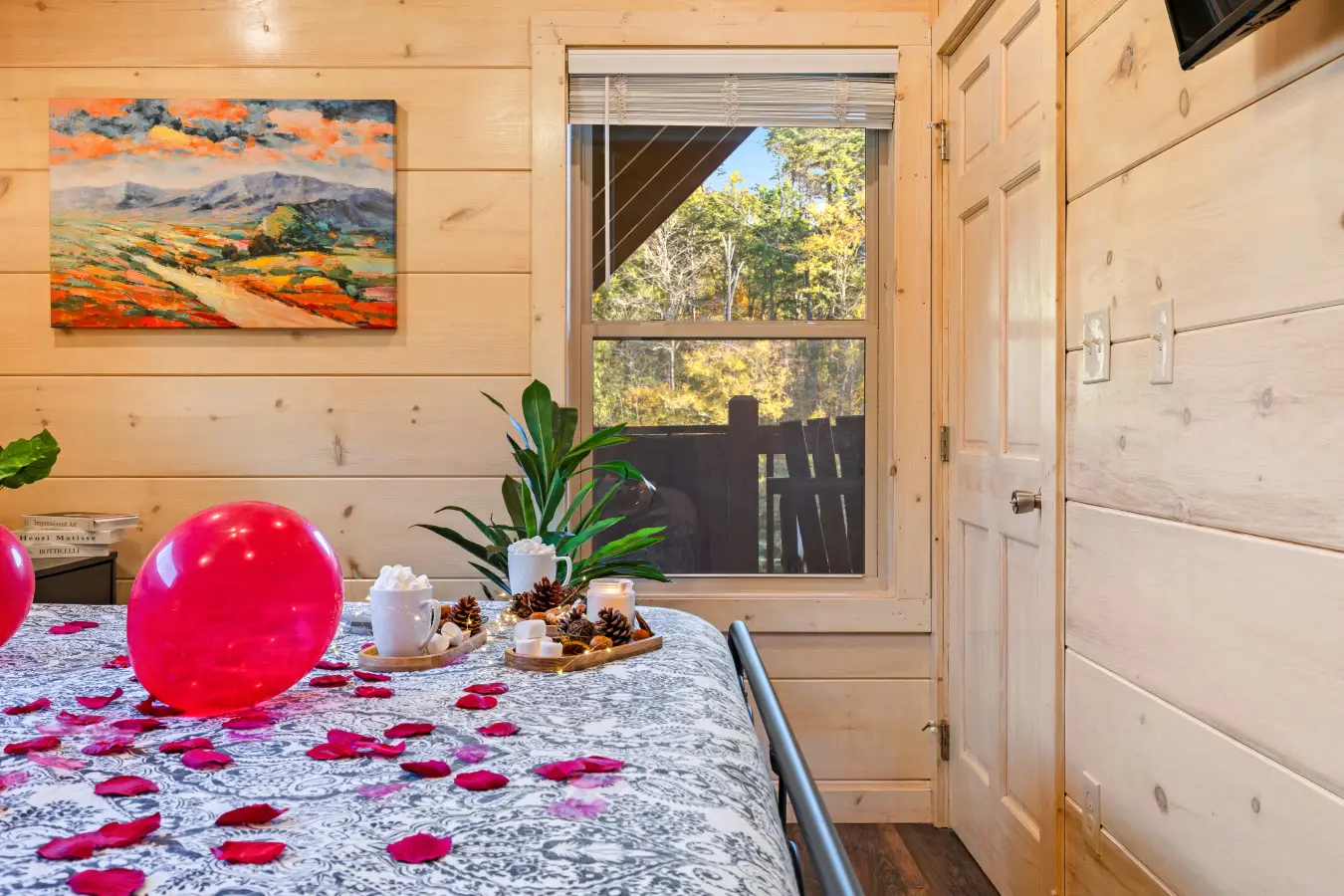 This cabin’s master suite is designed for love—soft lighting, breathtaking views, and private access to the deck.