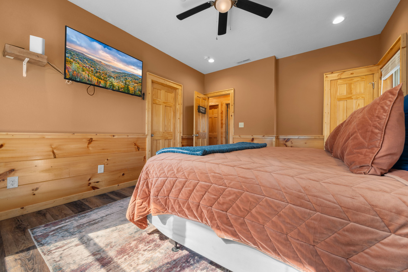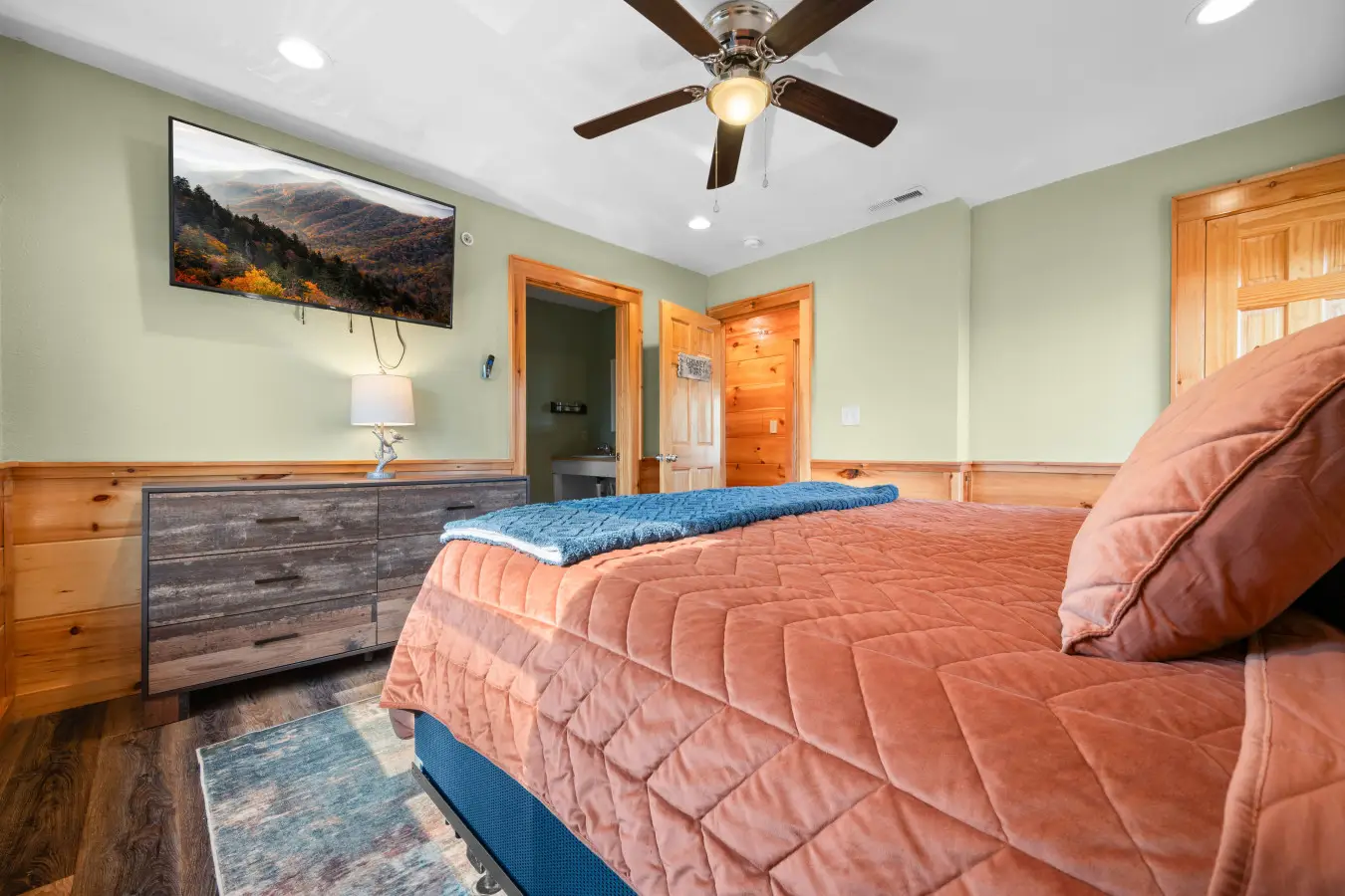 Our cabin features a private indoor pool that is heated for your enjoyment. The pool’s temperature is carefully maintained between 82 and 84 degrees Fahrenheit, ensuring a comfortable swimming experience throughout your stay.