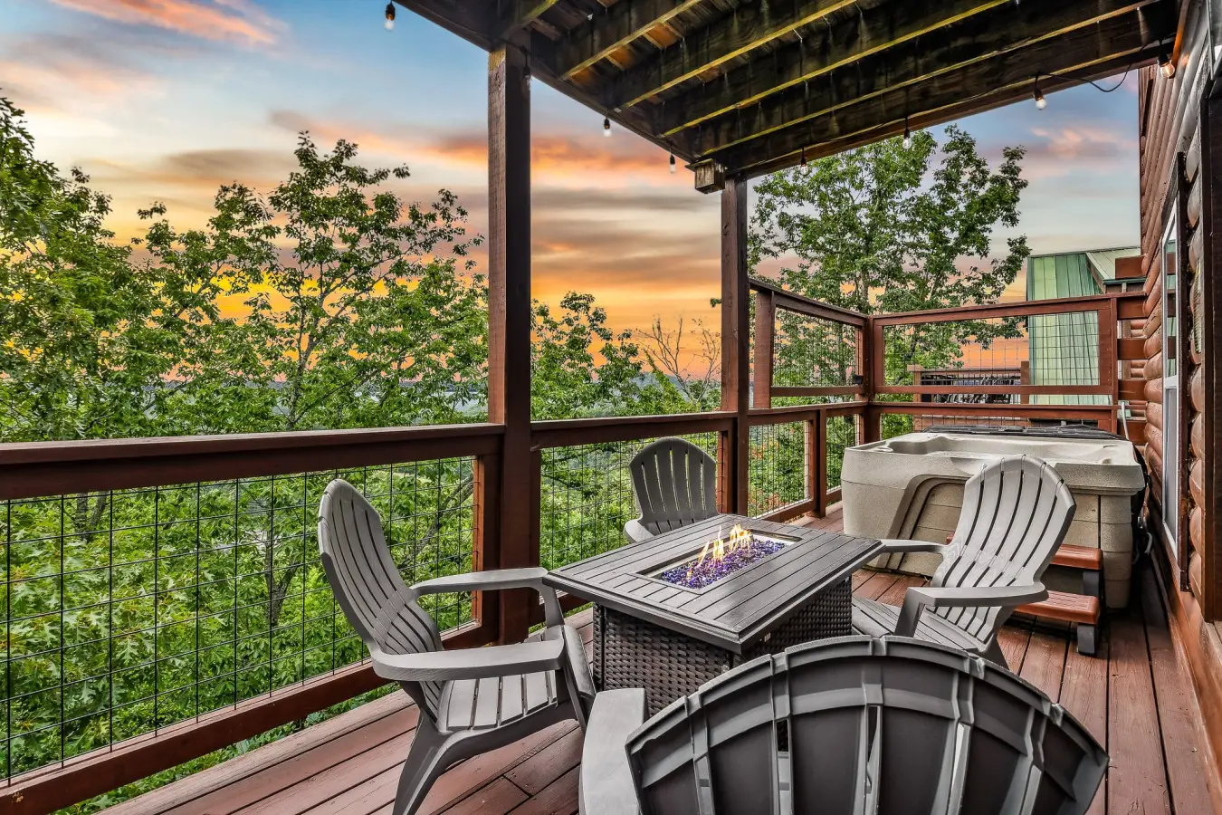Cozy up by the fire pit or soak in the hot tub while the Smoky Mountains glow at sunset.