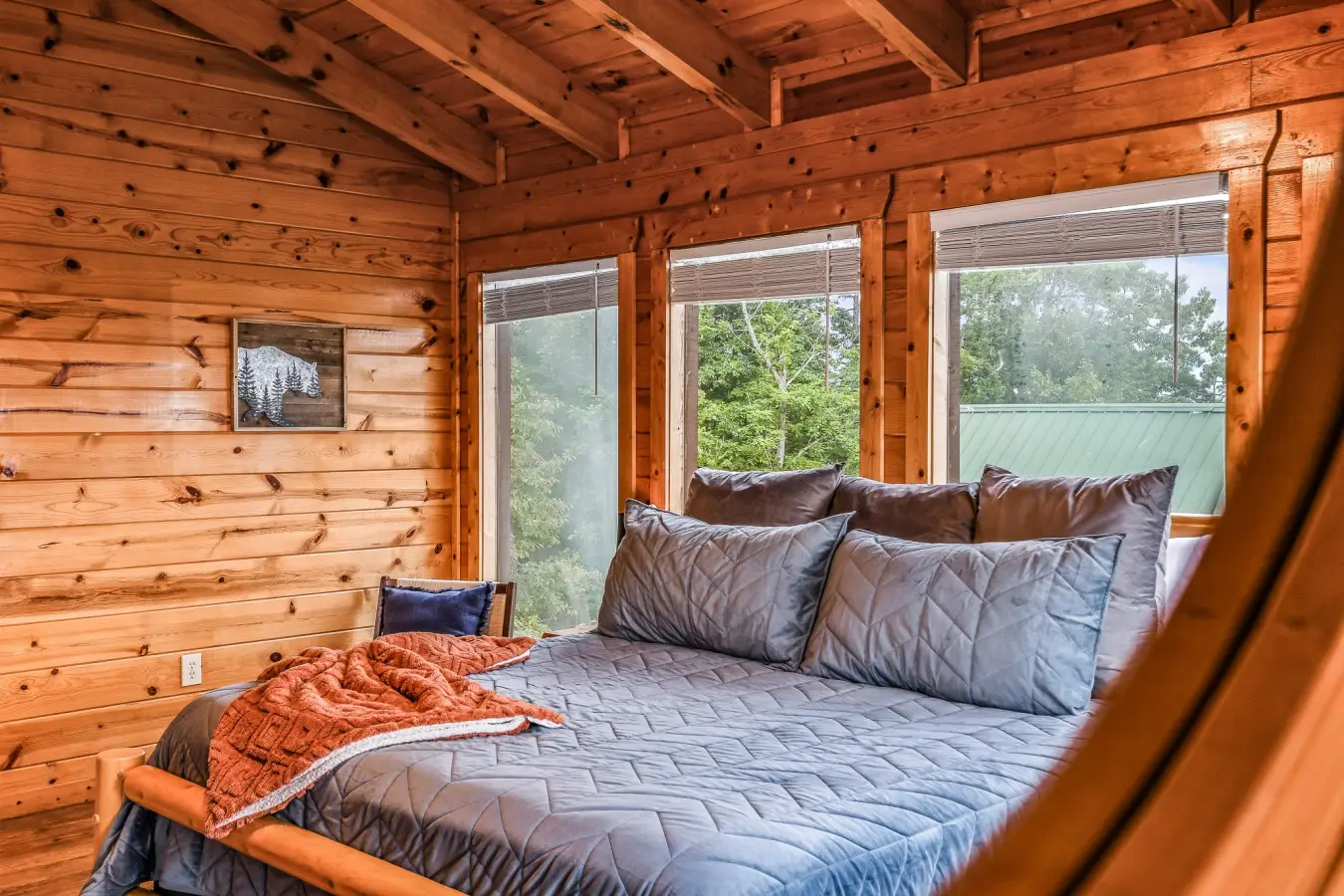 Wake up to floor-to-ceiling views in this cabin’s master suite—mountains as far as the eye can see.
