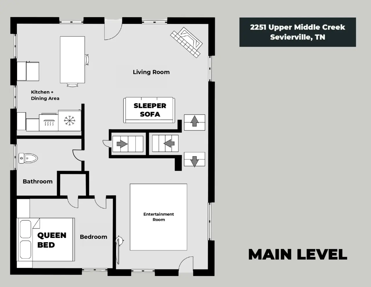There are two steps to get from the street to the porch of the cabin. Once inside the cabin has steps to the upstairs area and steps downstairs. It also has a bedroom and bathroom on the main floor.