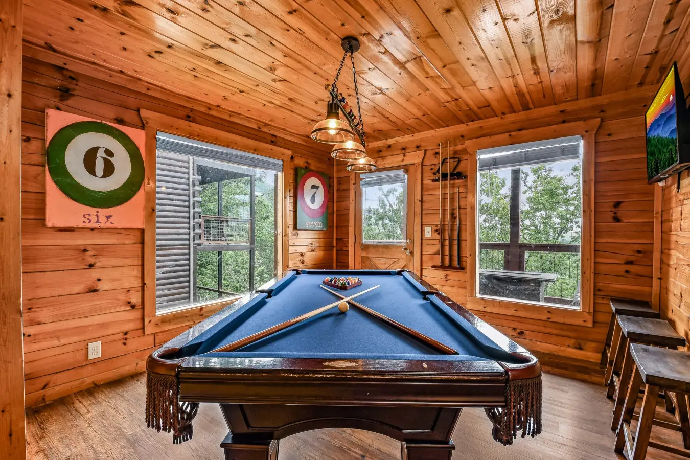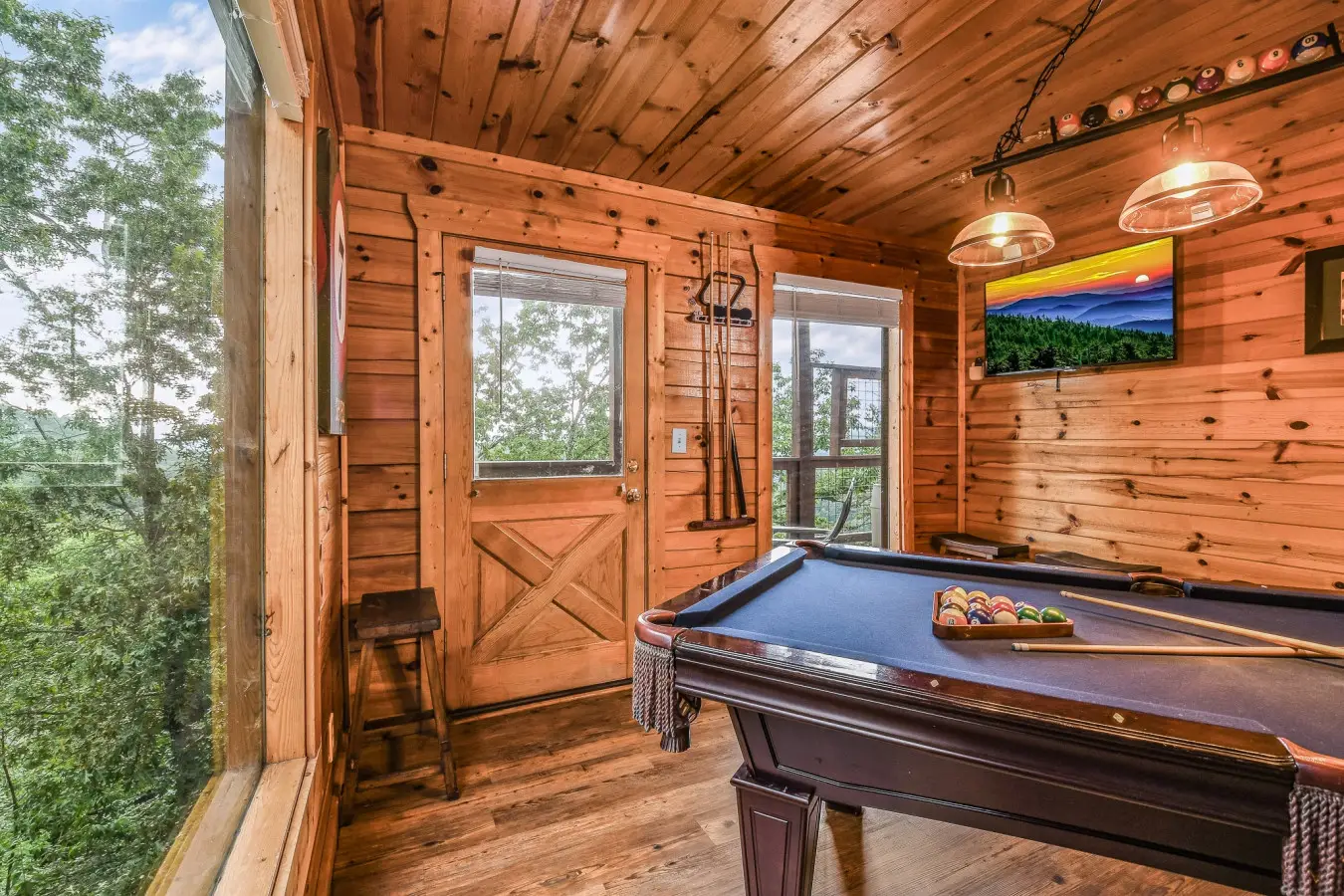 Play pool with a view in this cabin’s game room, framed by huge windows and a big-screen HDTV.