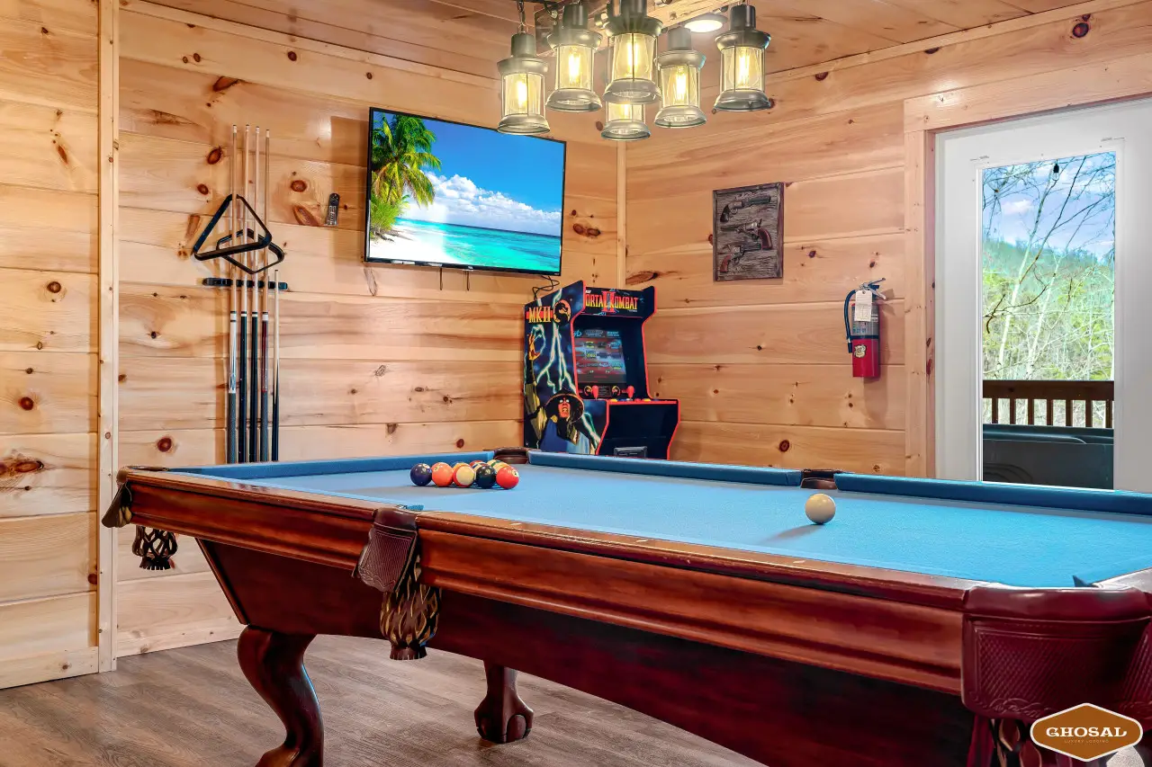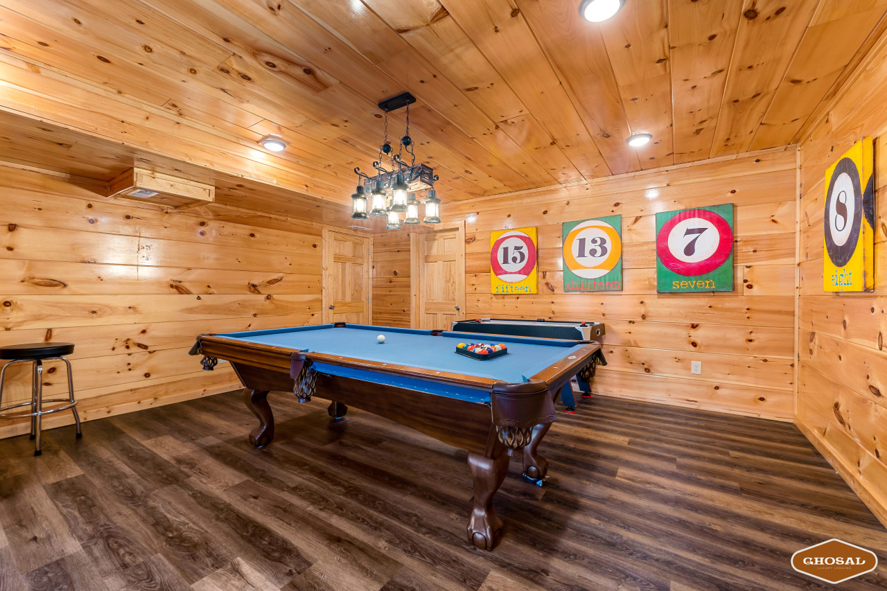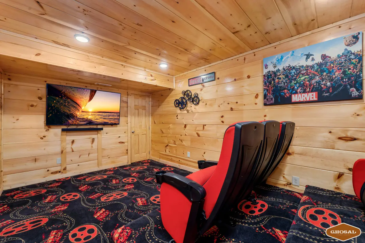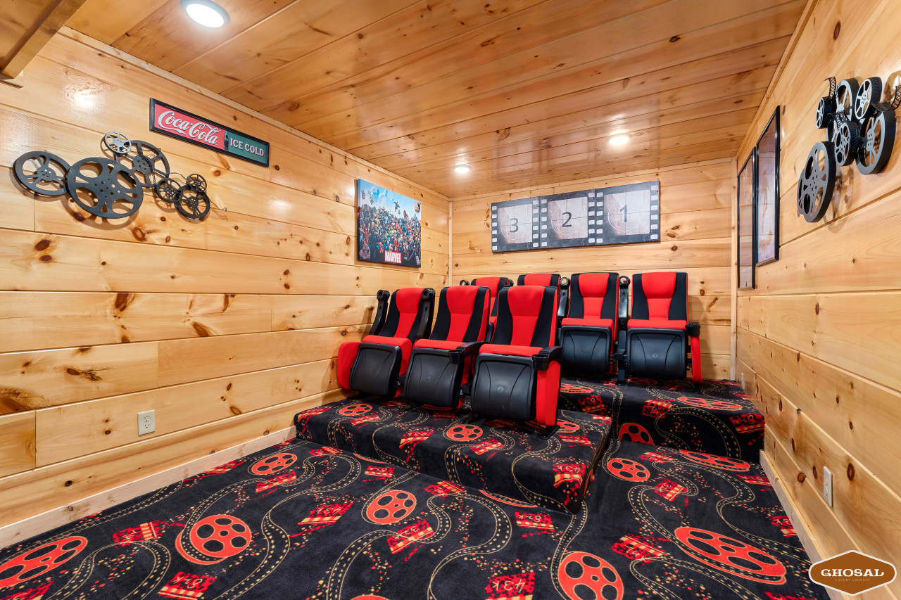 Inside Heavenly Heights, you’ll find everything you need for a comfortable stay. The cabin features 4 bedrooms and 4 bathrooms, giving everyone their own space. Head downstairs to enjoy a swim in the heated indoor pool or spend time in the game room with arcade games and a pool table. The home theater includes 10 chairs arranged in two rows of five—perfect for movie nights with the whole crew.