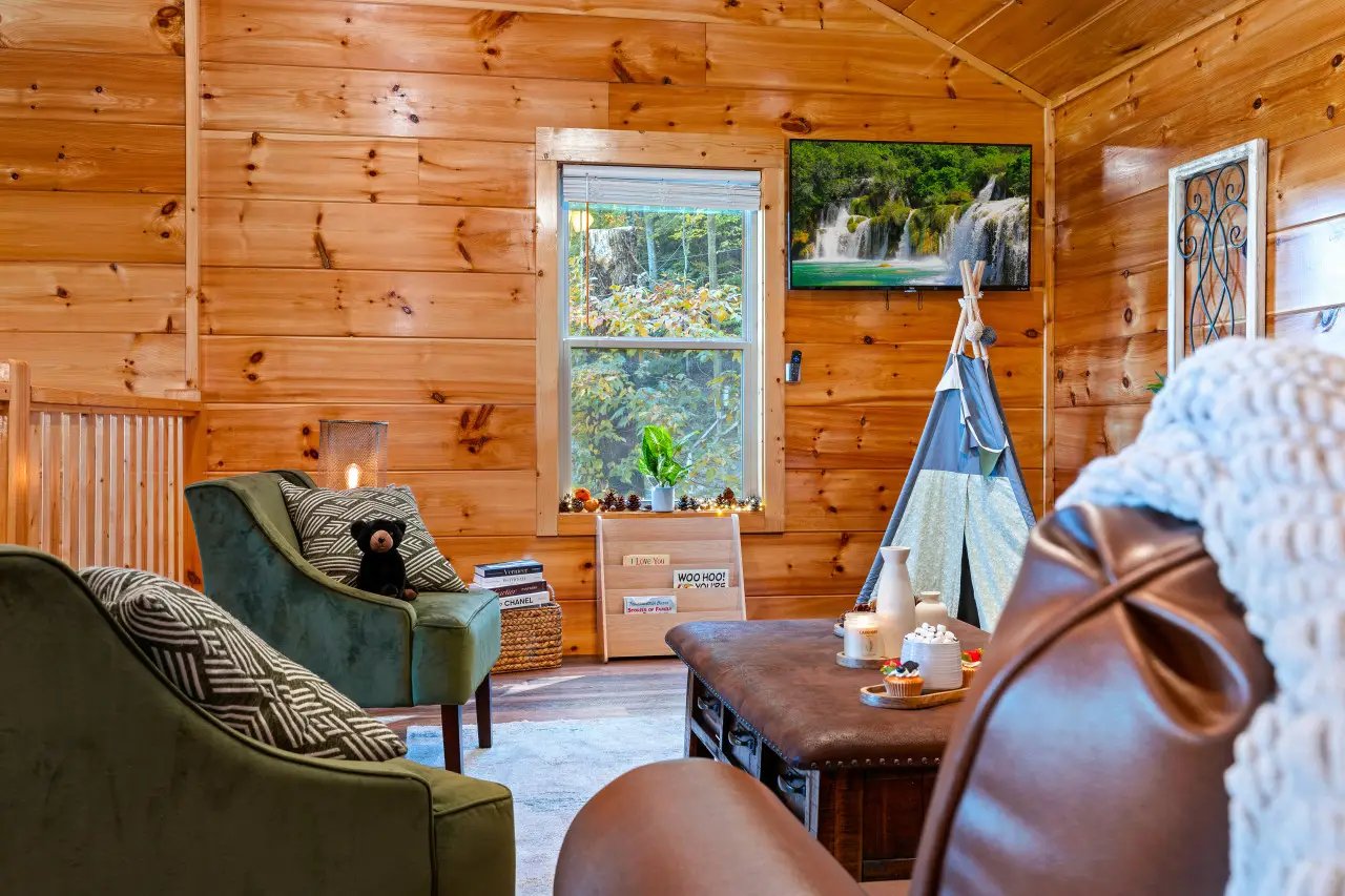 In this cabin, enjoy a spacious living room with plenty of cozy sofas, kid-friendly games, and a perfect space for family fun.