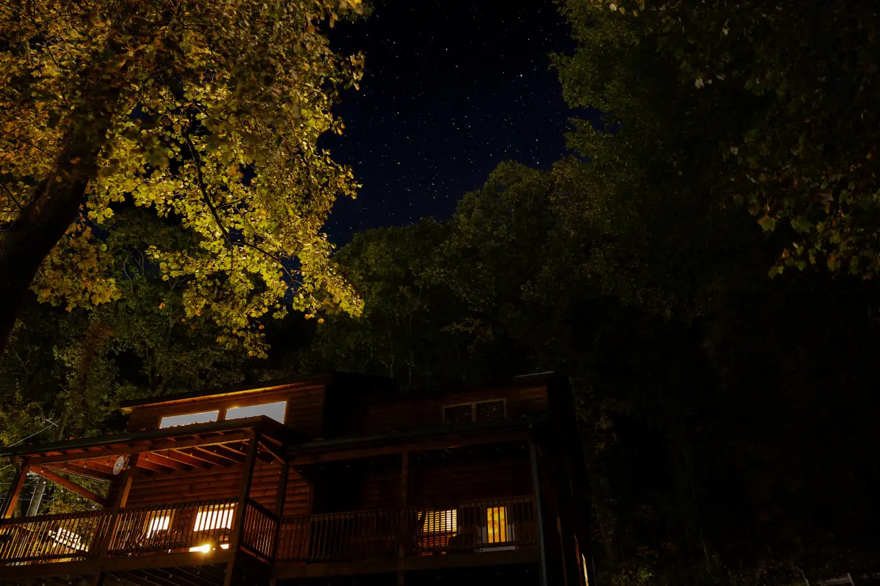 Stay up late, sit on the porch, and take in the beauty of a forest cabin at night.