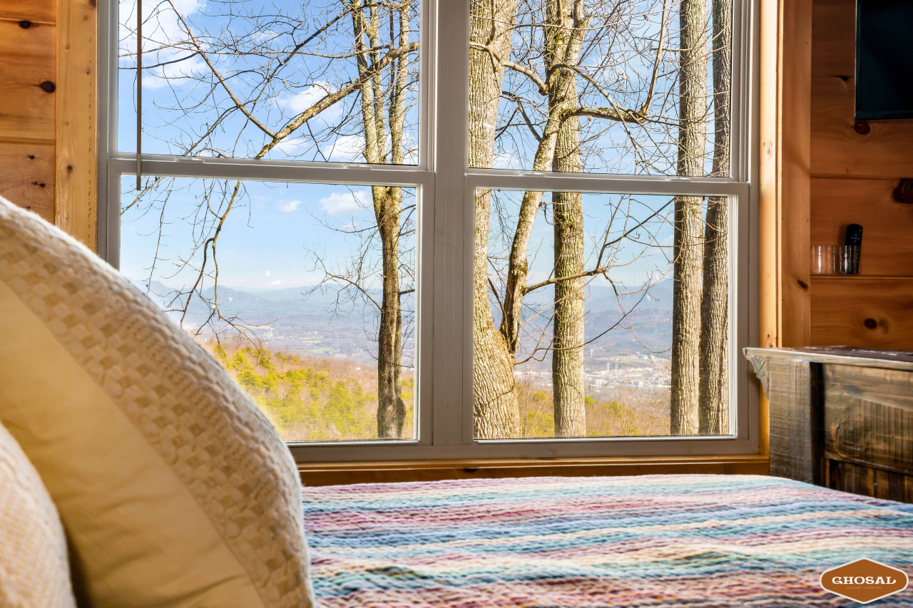 Bedroom 3: A room with a view that’s impossible to resist. Cozy bedding and mountain magic await.