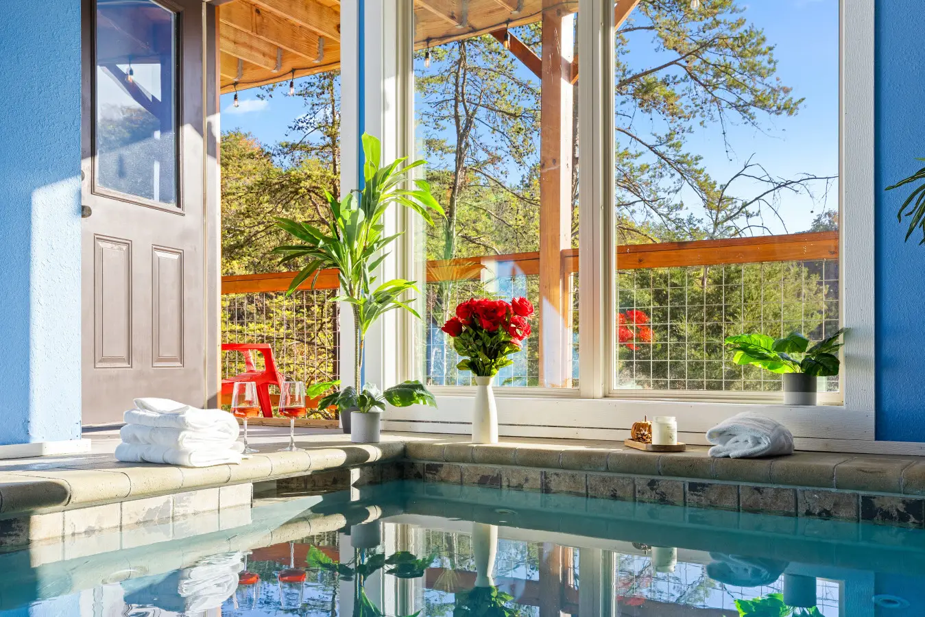 Heated Indoor Pool: Our cabin features a private indoor plunge pool that is heated for your enjoyment. The pool’s temperature is carefully maintained between 80 and 84 degrees Fahrenheit, ensuring a comfortable swimming experience throughout your stay.