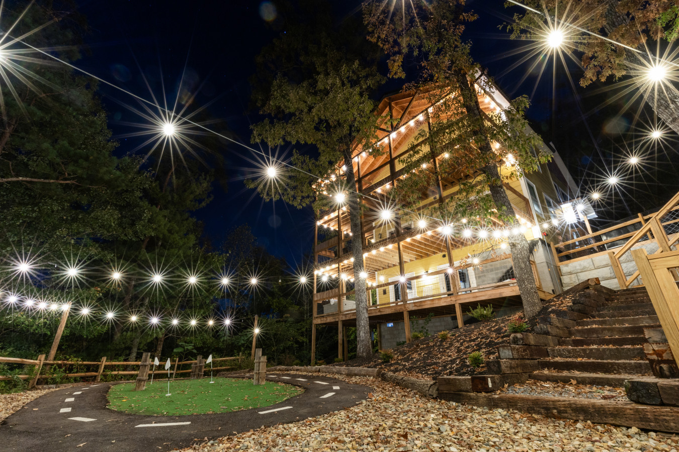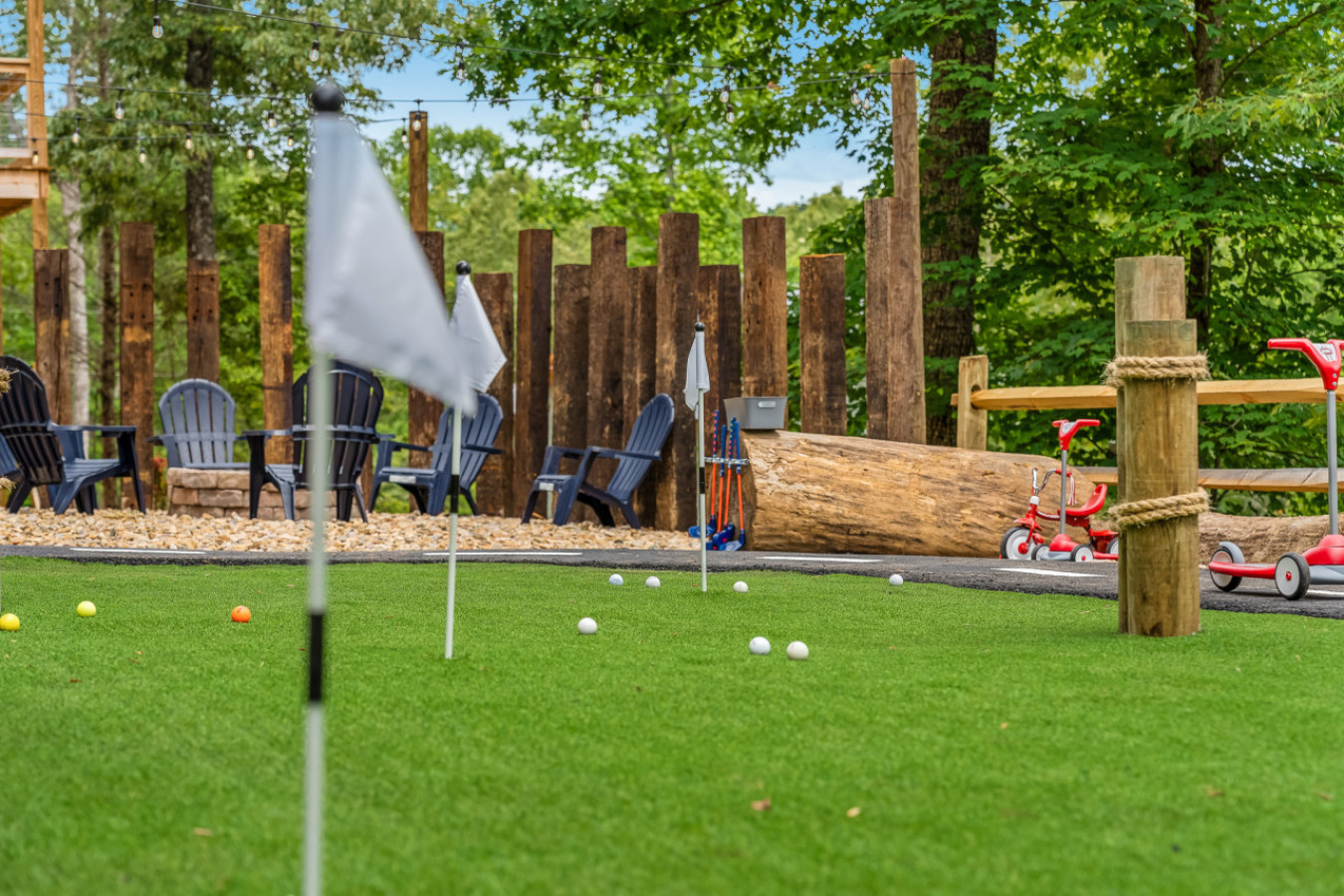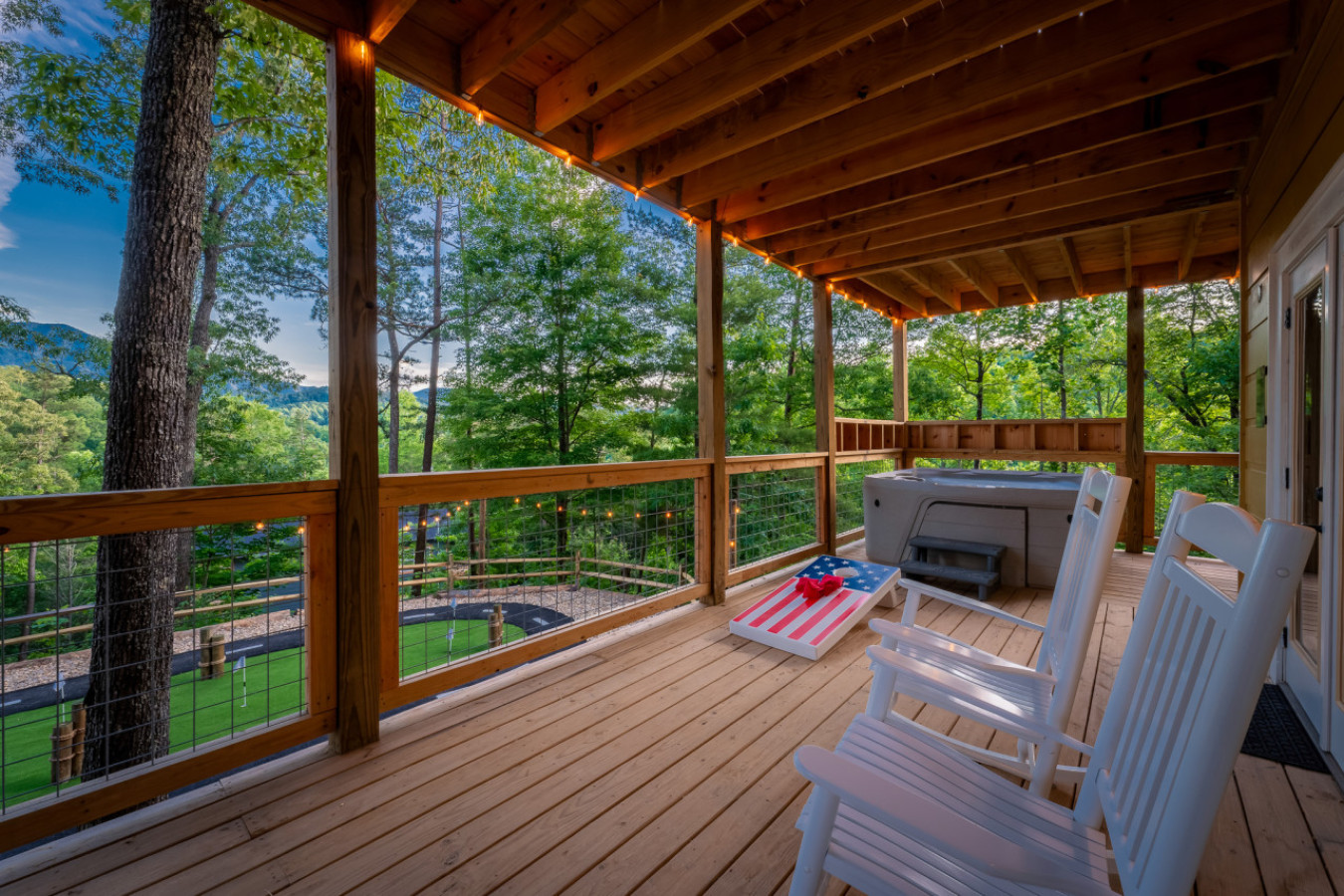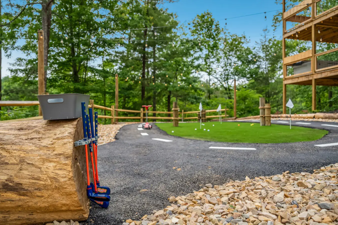 Outside, the resort continues to impress with its extensive grounds designed for fun and relaxation. Guests can enjoy a private mini-golf course, a fleet of children’s bikes and mini cars with a dedicated circuit, and a mini climbing area for young adventurers. The expansive decks and outdoor seating areas provide breathtaking views of the Smoky Mountains, making them the perfect backdrop for unforgettable memories.