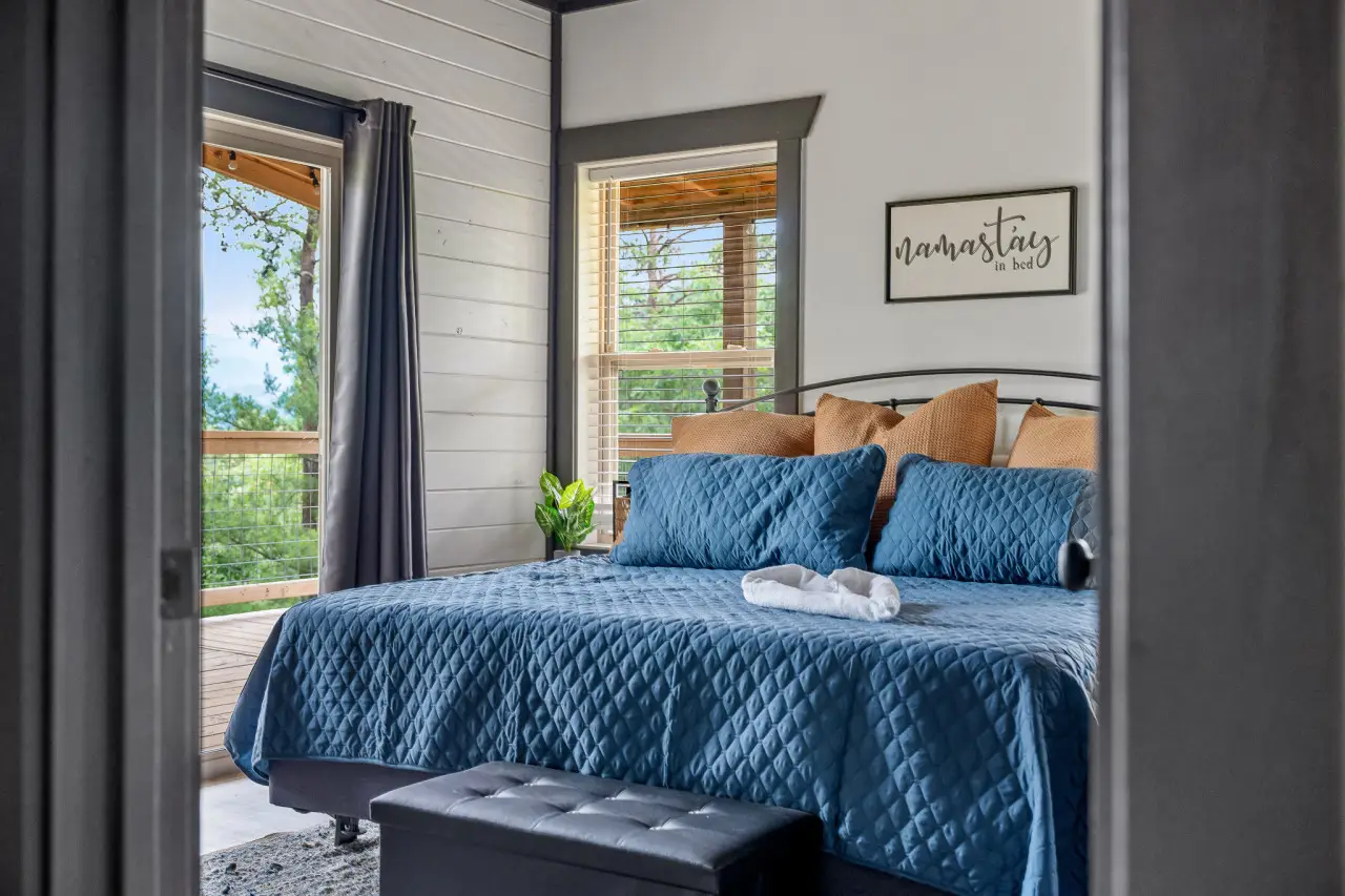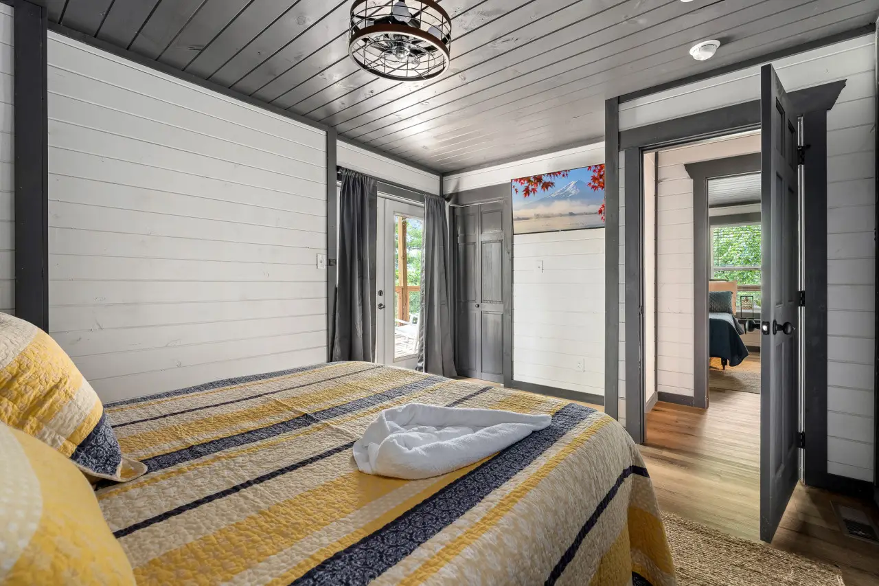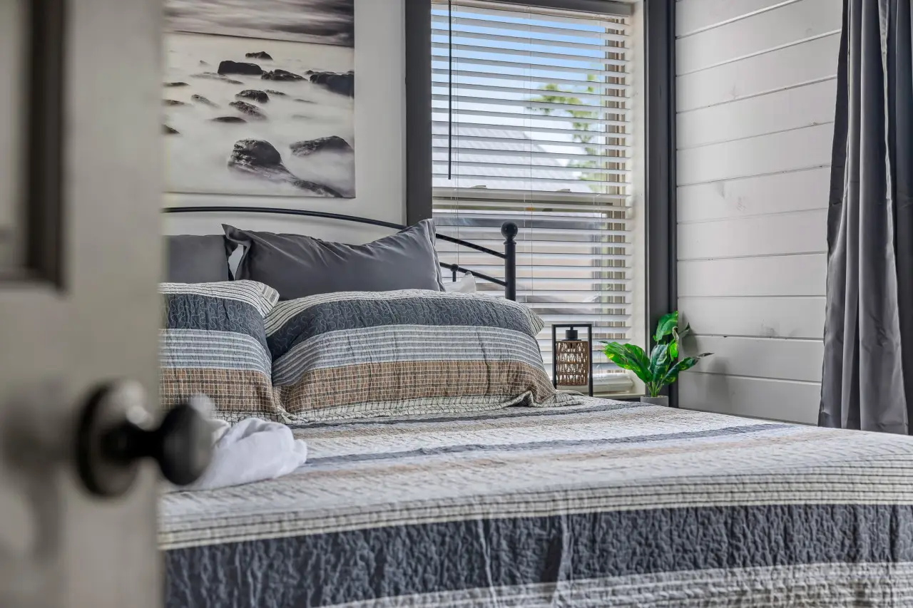 Bedroom 1: Soft linens, peaceful vibes, and a window to the trees—it’s all yours.