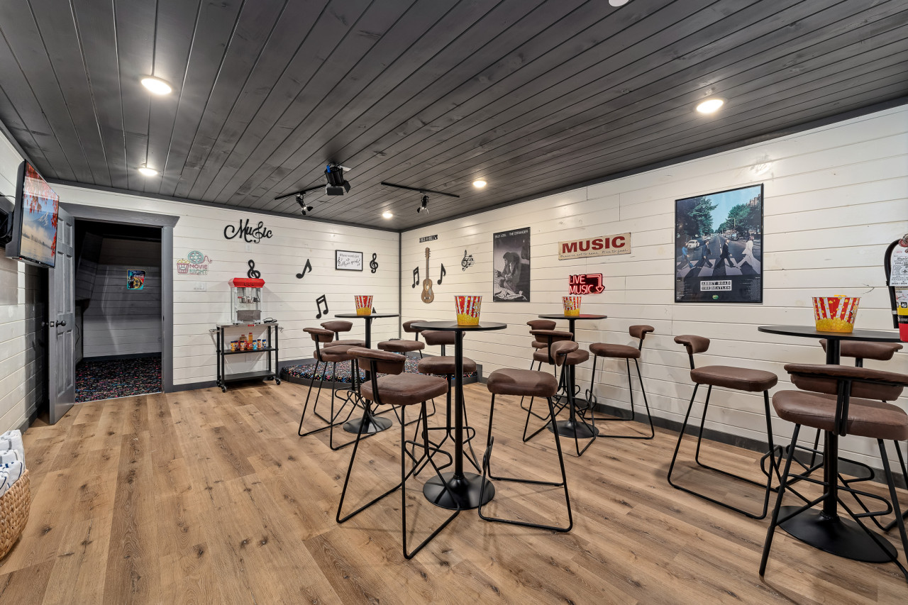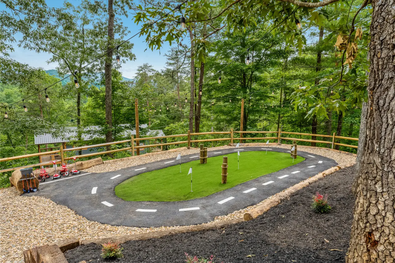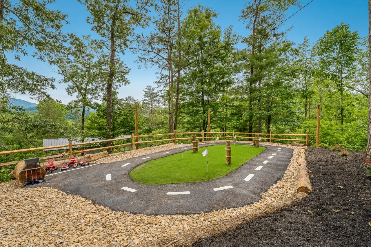 Located in Gatlinburg, Sweet Escape provides a blend of modern style and comfort. The fully stocked kitchen makes meal preparation easy, and the dining area is great for gathering with family and friends. The cabin features a game room, karaoke room, private movie theater, and outdoor activities like a mini golf course, race kart track, and mini rock climbing wall—keeping everyone entertained.