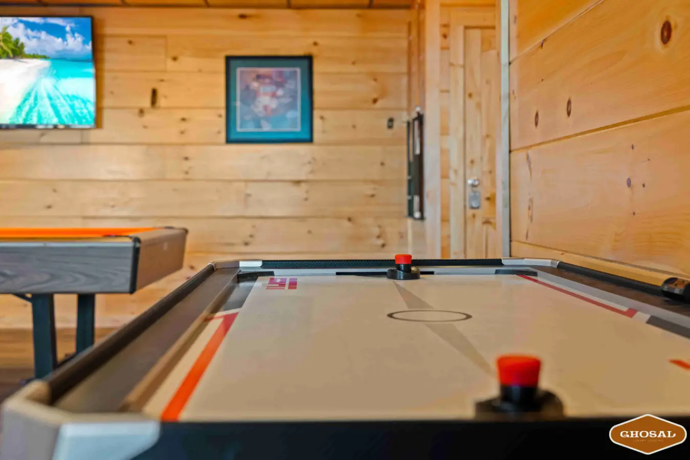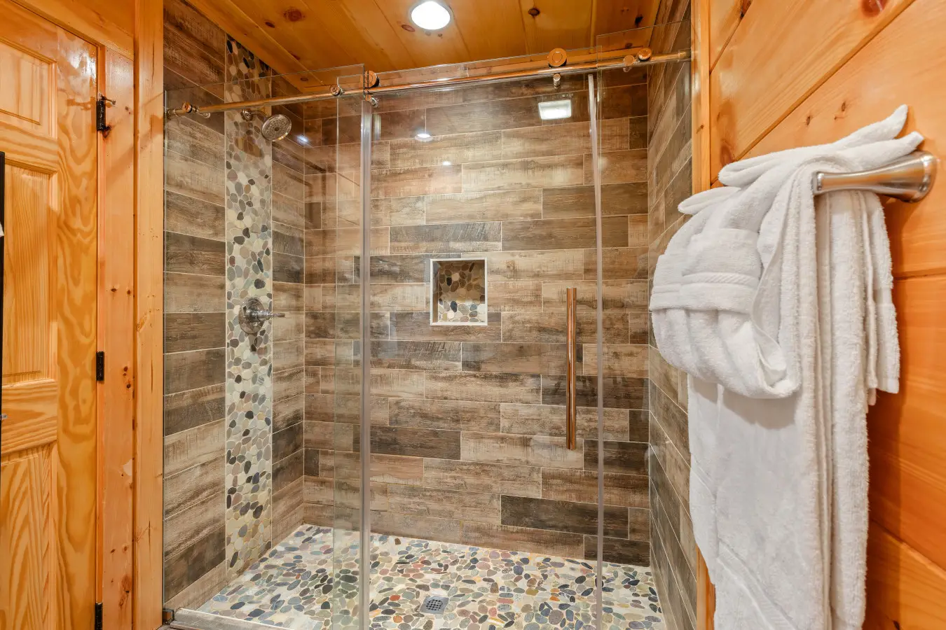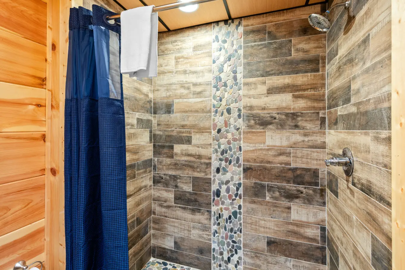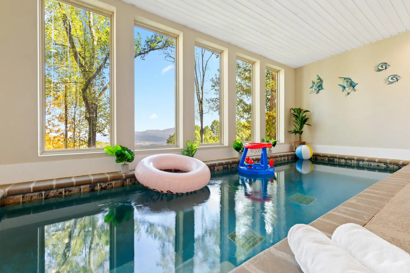Our cabin features a private indoor pool that is heated for your enjoyment. The pool’s temperature is carefully maintained between 82 and 84 degrees Fahrenheit, ensuring a comfortable swimming experience throughout your stay.