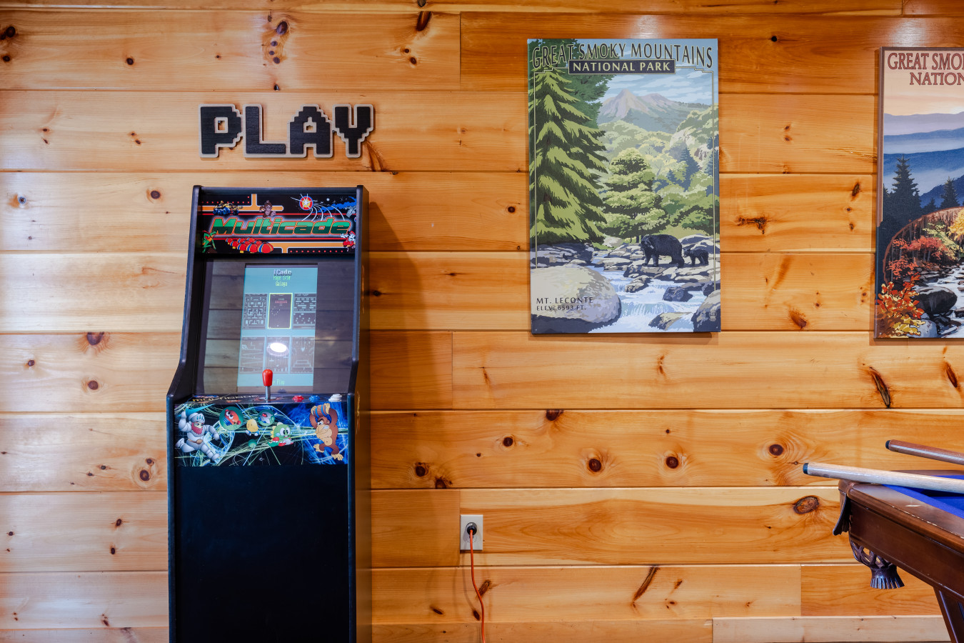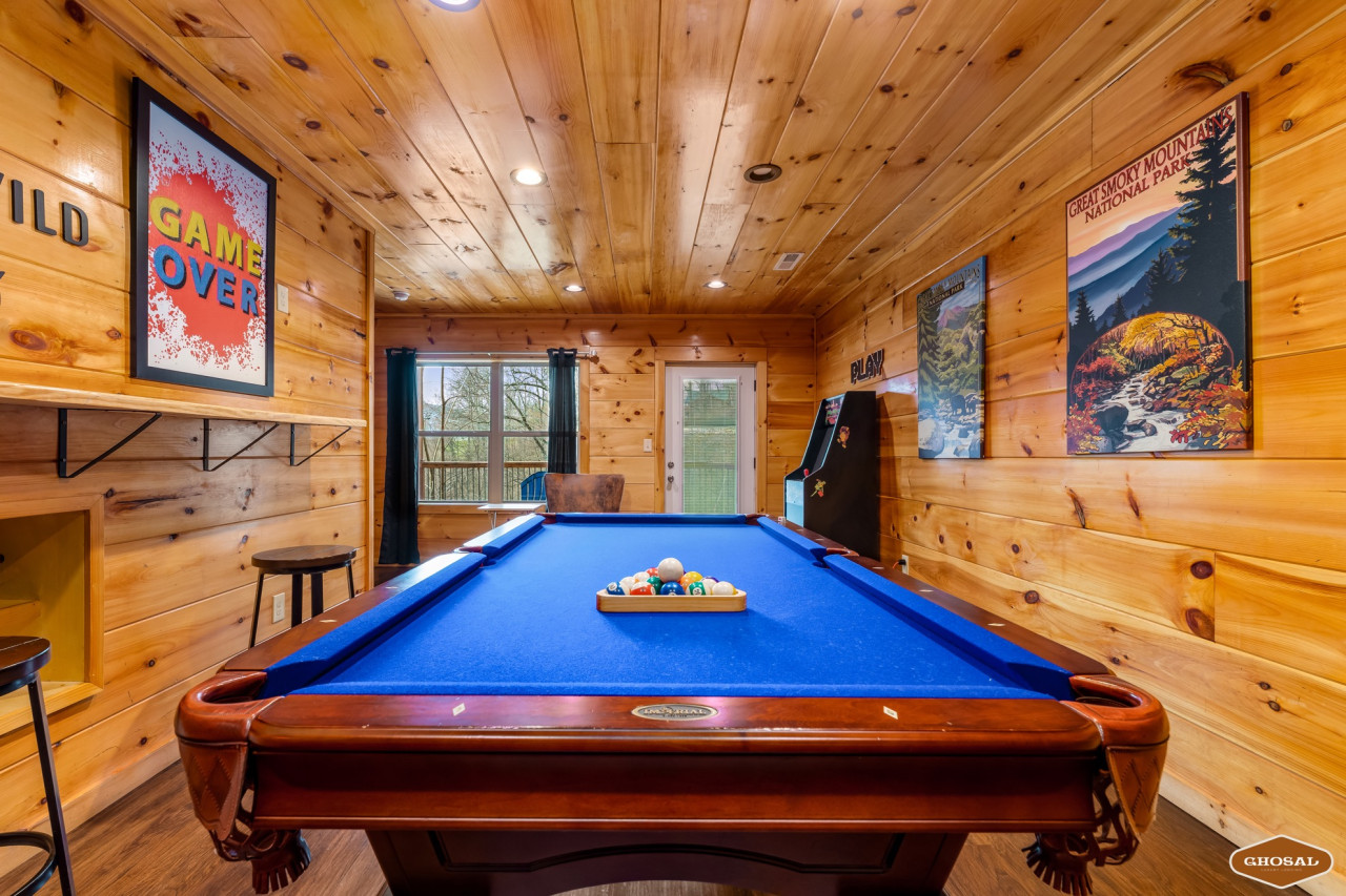 In this cabin, fun meets relaxation—enjoy pool and arcade games with panoramic mountain views right from the deck.