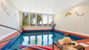 The indoor pool is heated between 82 and 84 degrees Fahrenheit. Our team will require access to the cabin twice a week for pool maintenance, and we request that pets are crated during these times.